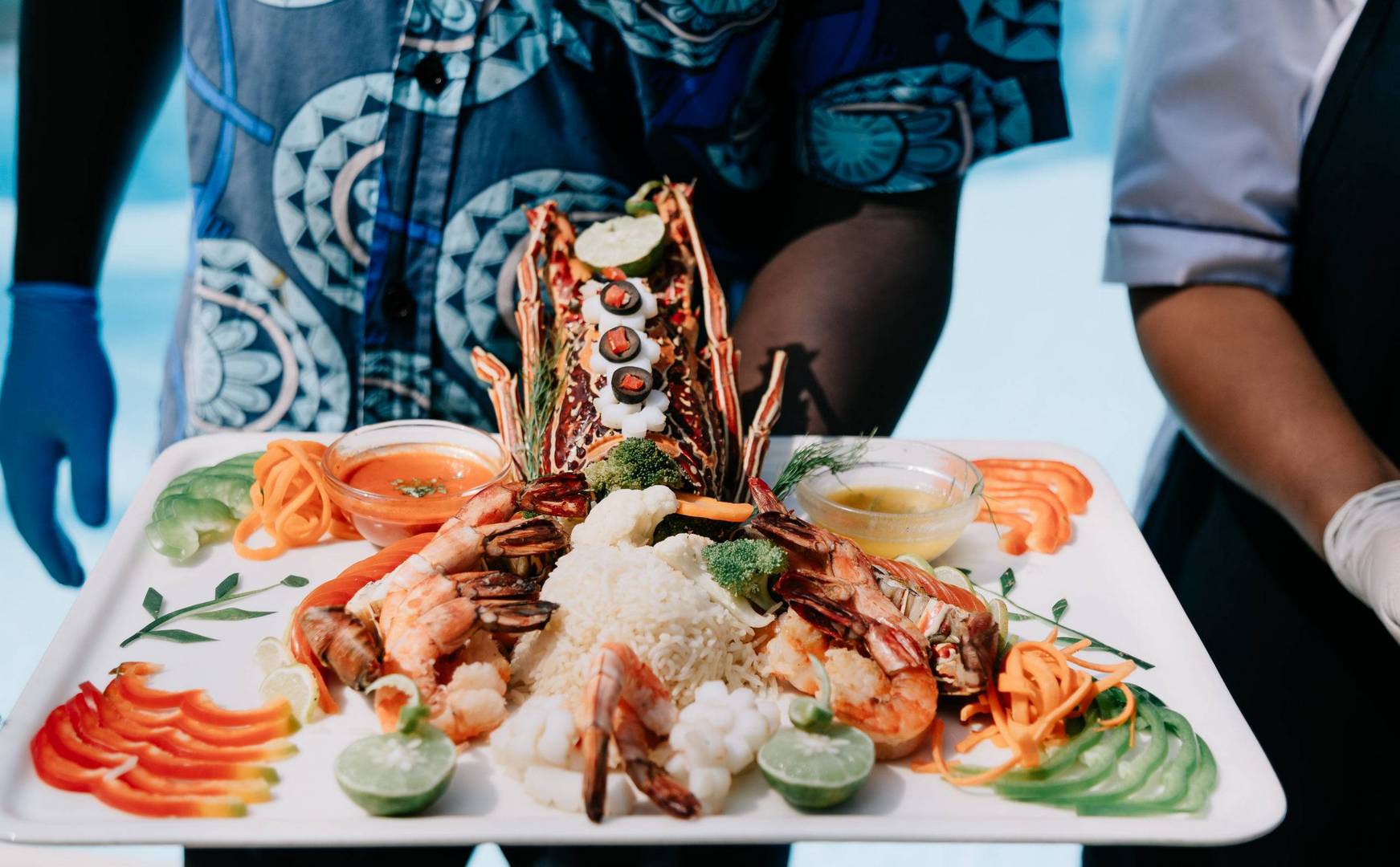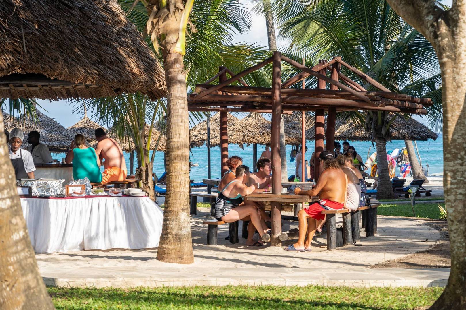 The resort’s signature dining destination features a stunning rustic design beneath a traditional makuti roof, creating the perfect respite from the tropical sun. This open-air restaurant offers an impressive fusion buffet experience with: